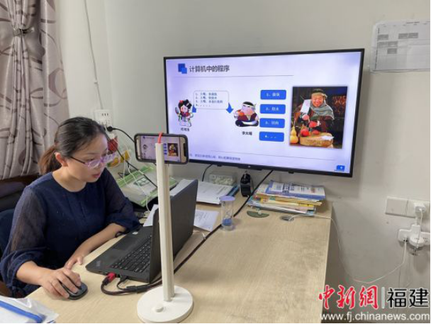图为:乐鱼网页版登录入口_乐鱼(中国)计算机信息学院教师彭青梅在线上教学中增加课堂趣味性和师生互动性。骆惠勇 摄