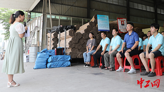 利用工休的15分钟,职工们在车间里全神贯注地聆听了一堂特别的“微党课”。这是5月28日上午,在福建省南安市雪峰开发区环亚泡塑企业有限公司切割车间内,由福建省泉州市总工会、南安市委组织部举行的“一刻钟”红色微党课宣讲进企业的一幕。