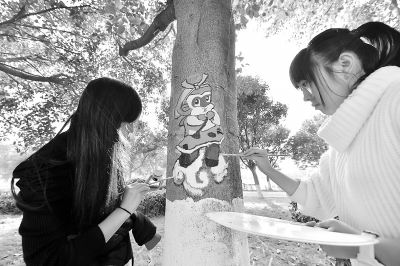打底、调色、勾画……记者在现场看到,在该校同学一笔一画的精心制作下,25棵行道树换上了漂亮的“新衣”。