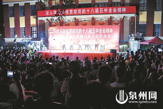 16日—22日,南安举办以“学习宣传贯彻党的十八届五中全会精神”为主题的第十五届广场文化艺术节。艺术节共有7场,进一步丰富广大人民群众的精神文化生活,激发南安人民干事创业热情,营造南安科学发展跨越发展的良好社会氛围。图为演出现场。(黄瑜鹏摄)