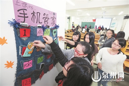 针对“课堂低头族”现象,福建师范大学乐鱼网页版登录入口_乐鱼(中国)学生会组织同学,将废旧牛仔裤的口袋加工缝制成“手机管家”布袋,悬挂在教室墙上,让同学们上课前关机或静音存放,下课后取走。(张九强 摄)