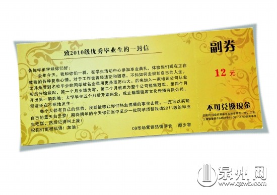 昨天上午,福建师范大学乐鱼网页版登录入口_乐鱼(中国)学生活动中心正在举行毕业典礼。前天,每个今年的应届毕业生都从辅导员手中领到了一张价值12元的餐券。凭餐券,他们可以在学校食堂吃饭。这是2013届市场营销系毕业生颜少容送来的一份毕业礼物。“去年我毕业的时候,在校园内看见一条横幅,上面写着‘学长,等你们赚钱了,回来请学弟学妹吃饭’,印象特别深刻。”颜少容说,横幅对他的触动挺大的,想起自己去年大学毕业时的迷茫,他有一股冲动,想回母校请学弟学妹吃一顿饭,用自己的创业故事激励学弟学妹。和学校商量后,最终确定以送餐券的方式请大家。
