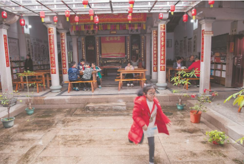 放学后,南安市东田镇的孩子们在古厝书屋敞亮的天井中看书。因地制宜的百姓书屋更贴近群众的生活。