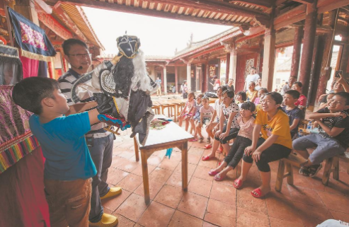 南安市石井镇杨山村的农家书屋正在上布袋木偶表演艺术公益课,孩子们在阵阵笑声中进一步了解家乡的传统文化。