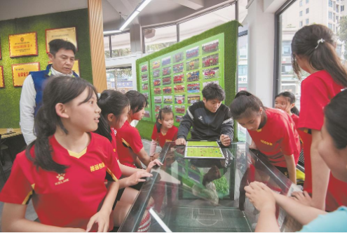 南安市区一间校园足球主题书屋,一群刚刚结束“市长杯”女足比赛的孩子在和教练讨论赛场上的技战术。