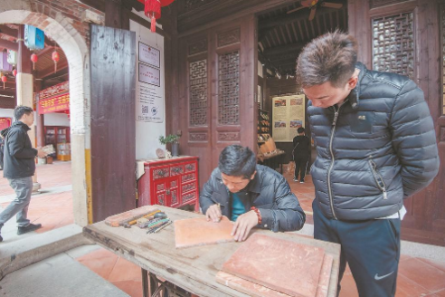 南安市石井镇的中宪第是一处著名的传统民居,建在这里的书屋与传统砖雕工作室相邻,一边是借阅的读者,一边是专注工作的师傅。