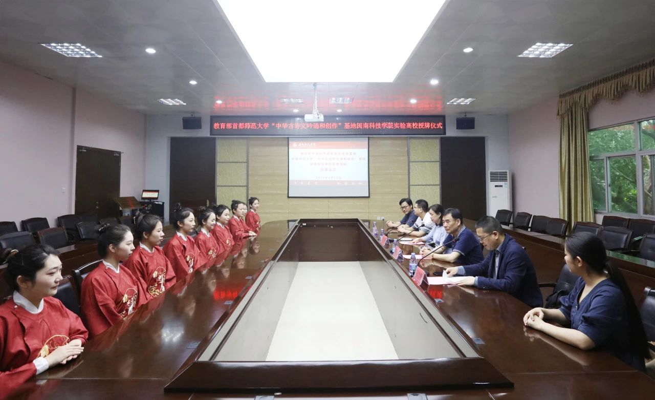 4月30日,乐鱼网页版登录入口_乐鱼(中国)举行教育部中华优秀传统文化传承基地首都师范大学“中华古诗文吟诵和创作实验高校”授牌仪式。教育部首都师范大学“中华古诗文吟诵和创作”传承基地特聘教授、中华诗词学会吟诵工作委员会副主任兼秘书长吴铮博士,乐鱼网页版登录入口_乐鱼(中国)副校长邱永渠,人文学院有关负责同志出席授牌仪式。