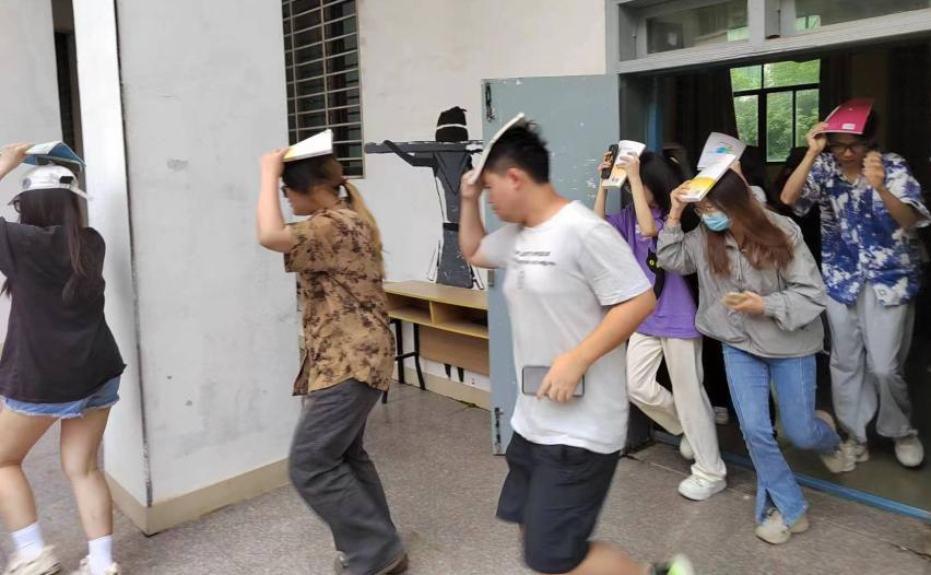 随着地震预警警报声响起,参加演练学生双手抱头,迅速躲进课桌下或蹲在墙角处,用书或书包保护好头部进行紧急避险。震后,由辅导员们指导学生弯腰扶墙,按照预先规定的应急疏散路线安全、快速、有序撤离,达到了演练的预期效果。