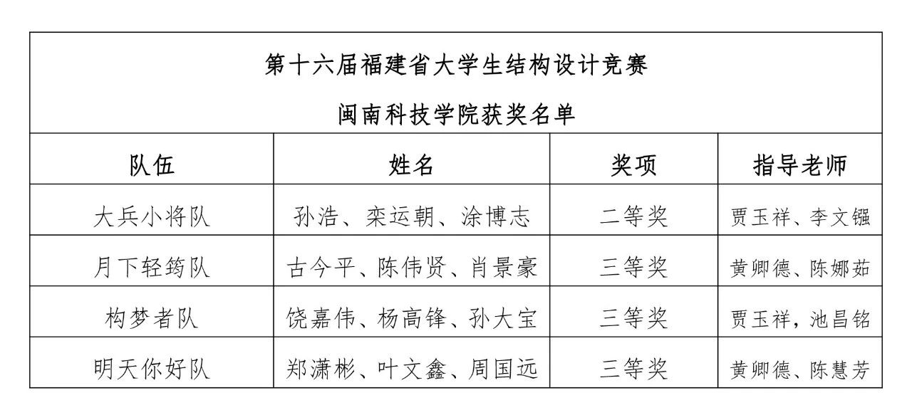近日,第十六届福建省大学生结构设计竞赛暨第十七届全国大学生结构设计竞赛福建省分区赛公布获奖名单,乐鱼网页版登录入口_乐鱼(中国)土木工程学院参赛队伍分别获得二等奖1项、三等奖3项的好成绩。