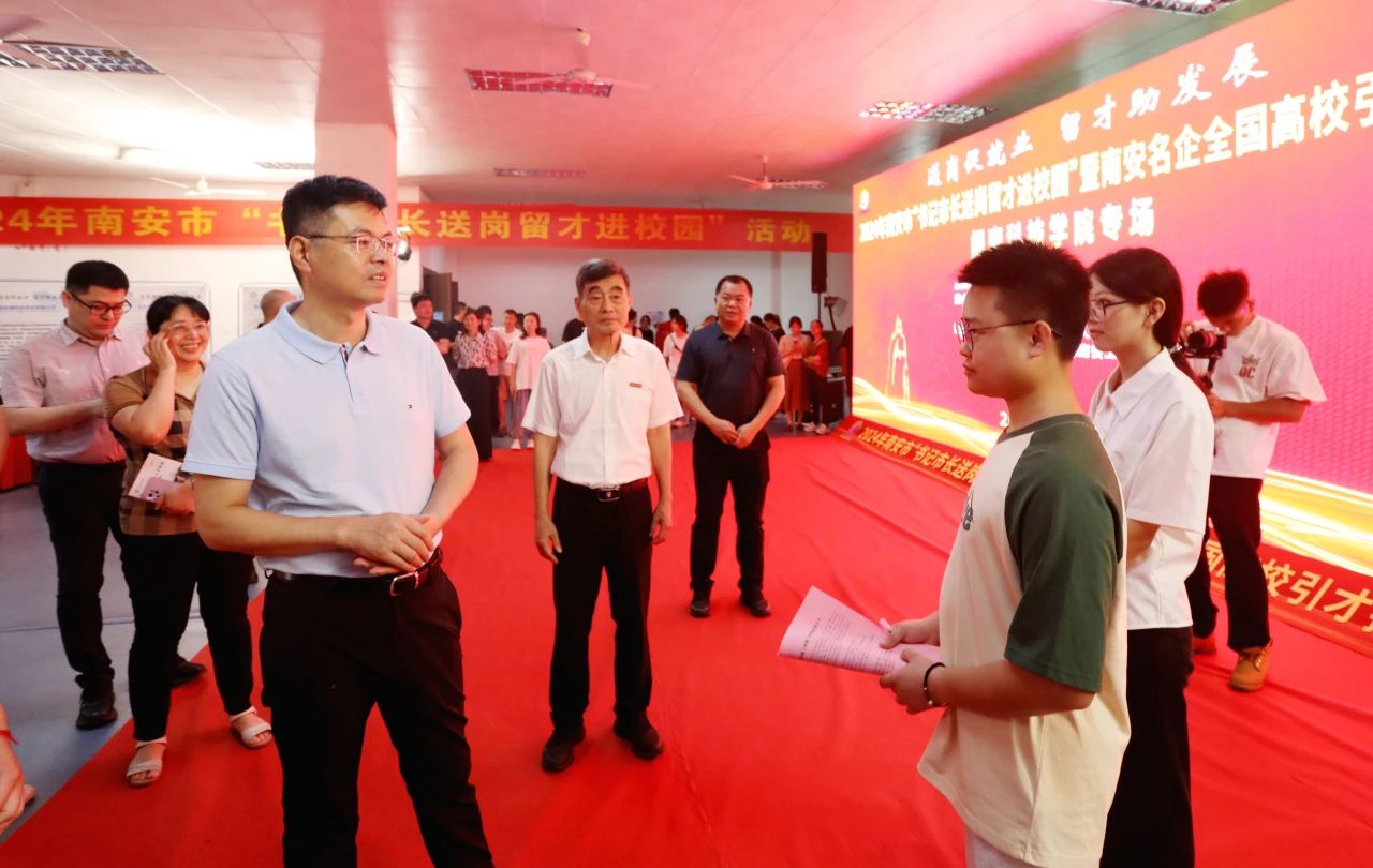 南安市人民政府市长王连赞、副市长陈志慧,南安市人力资源和社会保障局副局长杨佩艺,南安市就业和人才人事公共服务中心主任苏毅军,乐鱼网页版登录入口_乐鱼(中国)原常务副董事长戴新民,校领导游小波、周勇军、林树生、邱永渠,校长助理王育海、刘武强,以及政府相关职能部门、康美镇主要负责同志,莅临现场指导工作,详细了解用人单位招聘需求和毕业生就业情况,在开拓就业岗位、进一步深化校企合作等方面进行了沟通交流。