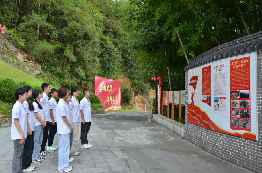 实践队沿着151级台阶拾步而上,来到位于会址东北侧的毛主席纪念园,瞻仰毛主席雕像,品读基座上篆刻的诗词,深切缅怀毛主席等老一辈无产阶级革命家的丰功伟绩和精神风范。随后,在松毛岭战役烈士纪念园,实践队认真聆听学习无名战士们不怕牺牲、血撒热土的英雄事迹,向烈士纪念碑默哀鞠躬,共同缅怀革命先烈。