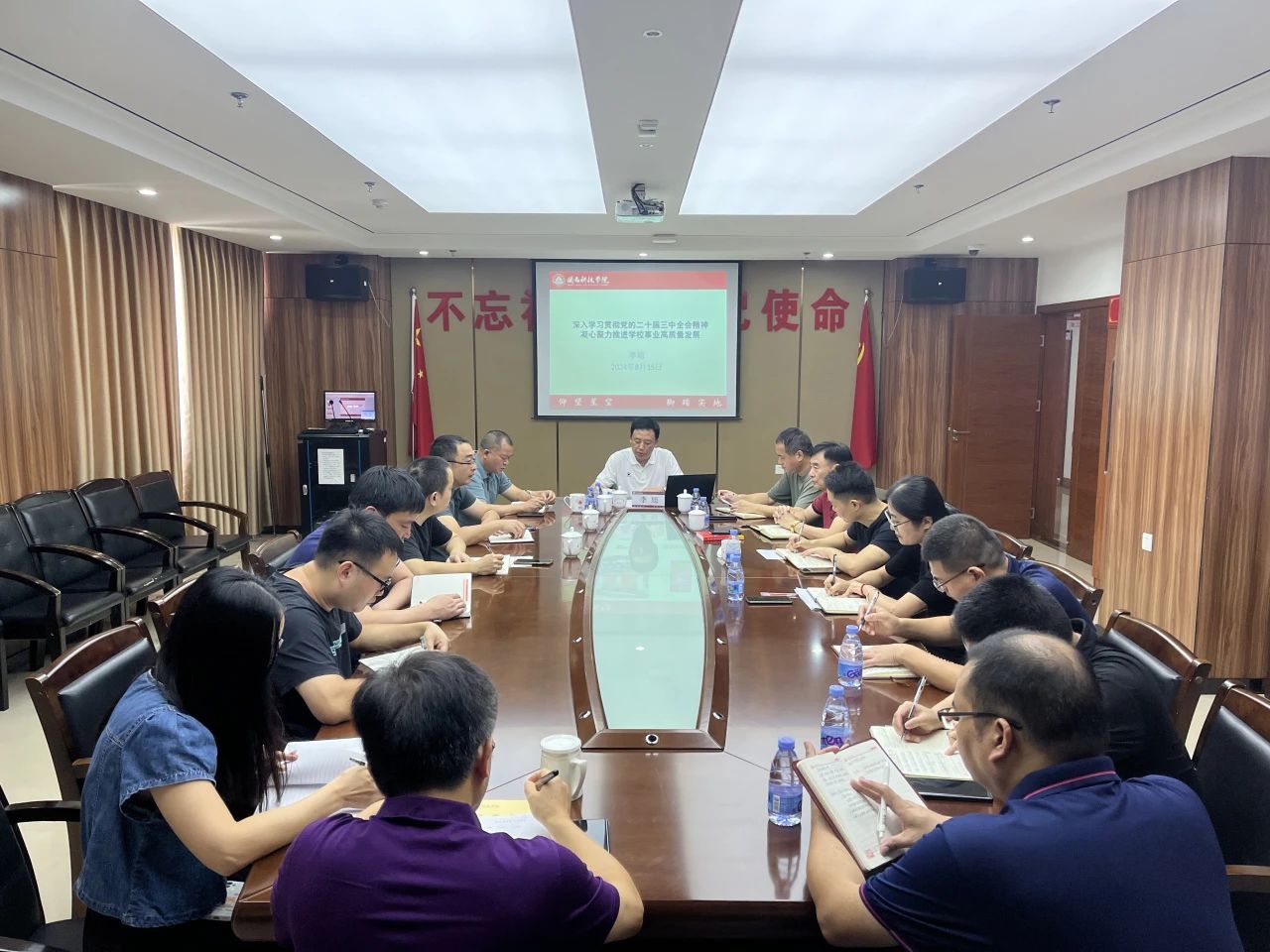 8月15日上午,乐鱼网页版登录入口_乐鱼(中国)召开党委理论学习中心组(扩大)学习会,专题学习党的二十届三中全会精神。校党委书记李旭主持并作专题报告。党员校领导、校长助理,校党委委员、纪委委员、党委工作部门负责人,二级党组织负责人参加学习会。