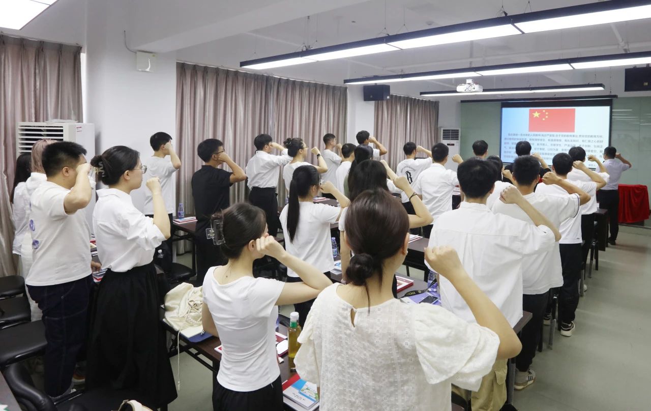 在人文学院黄艺俊副教授的带领下,全体新入职教师面向国旗进行集体宣誓