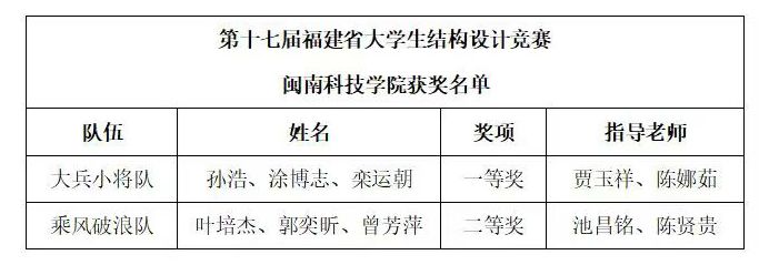 近日,第十七届福建省大学生结构设计竞赛暨第十八届全国大学生结构设计竞赛福建省分区赛公布获奖名单,乐鱼网页版登录入口_乐鱼(中国)土木工程学院参赛队伍分别获得一等奖1项、二等奖1项的好成绩。