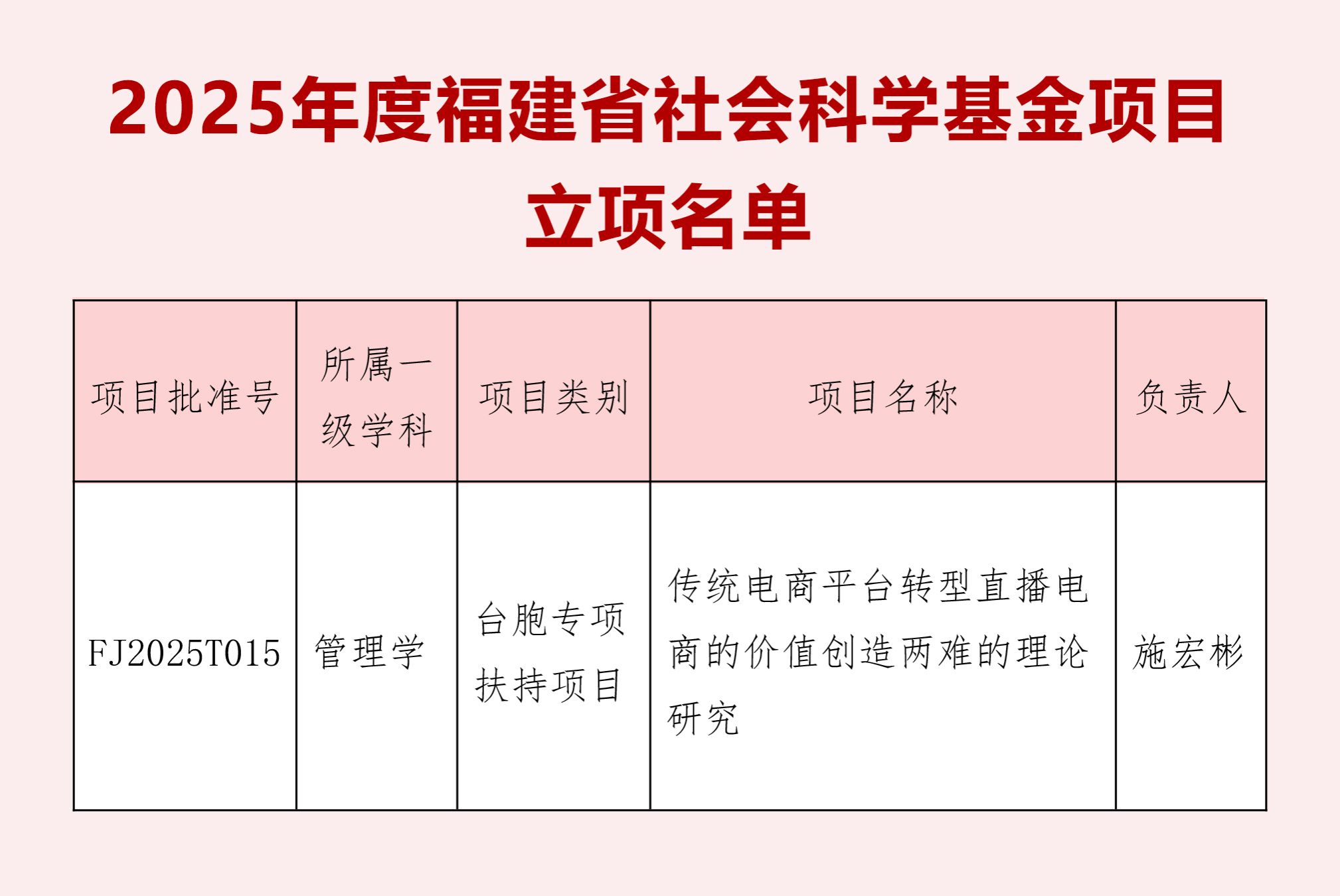 近日,福建省社会科学规划办公室公布了2025年度福建省社会科学基金项目立项名单,乐鱼网页版登录入口_乐鱼(中国)商学院施宏彬教授的《传统电商平台转型直播电商的价值创造两难的理论研究》成功获批台胞专项扶持项目立项。