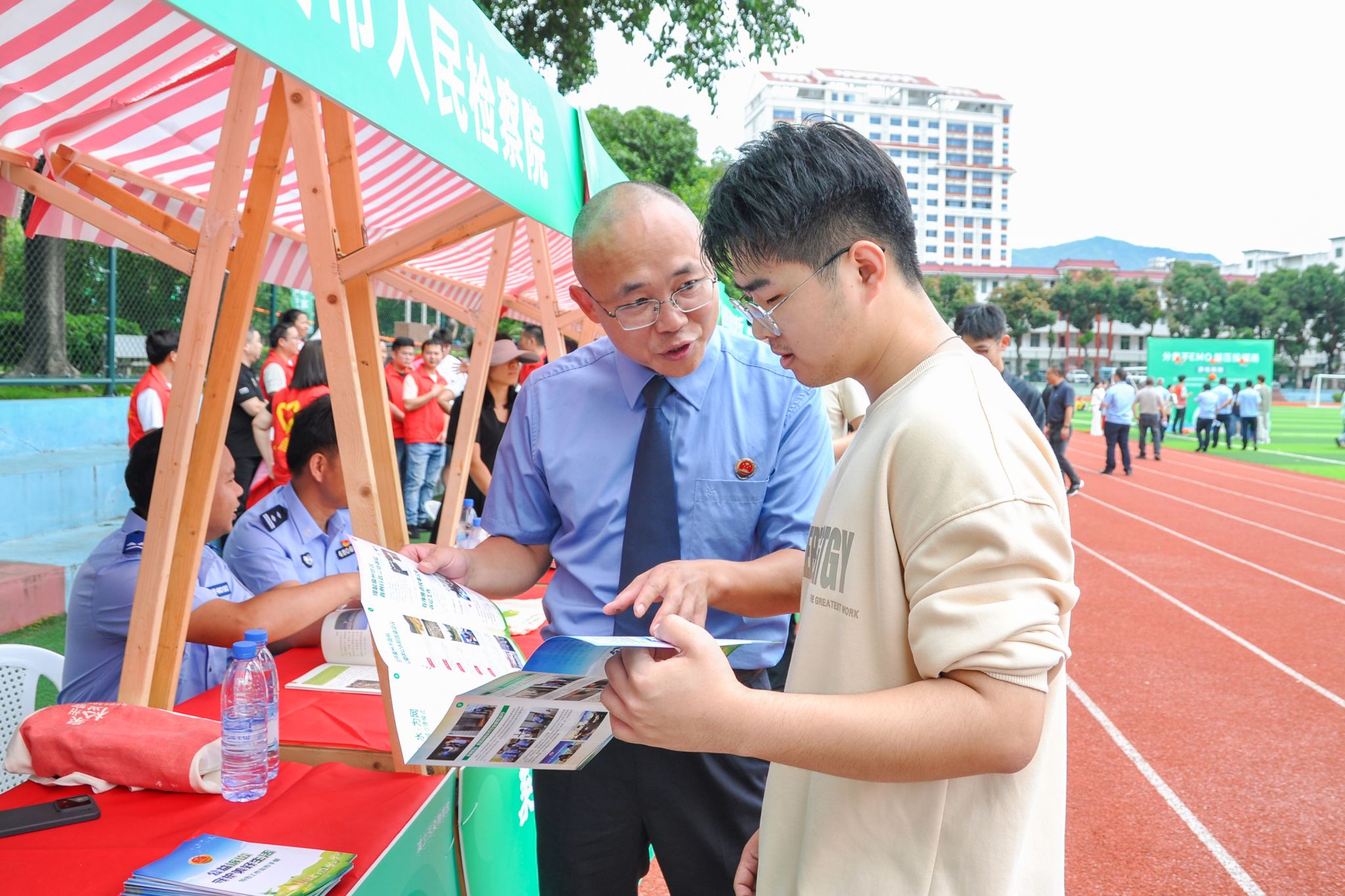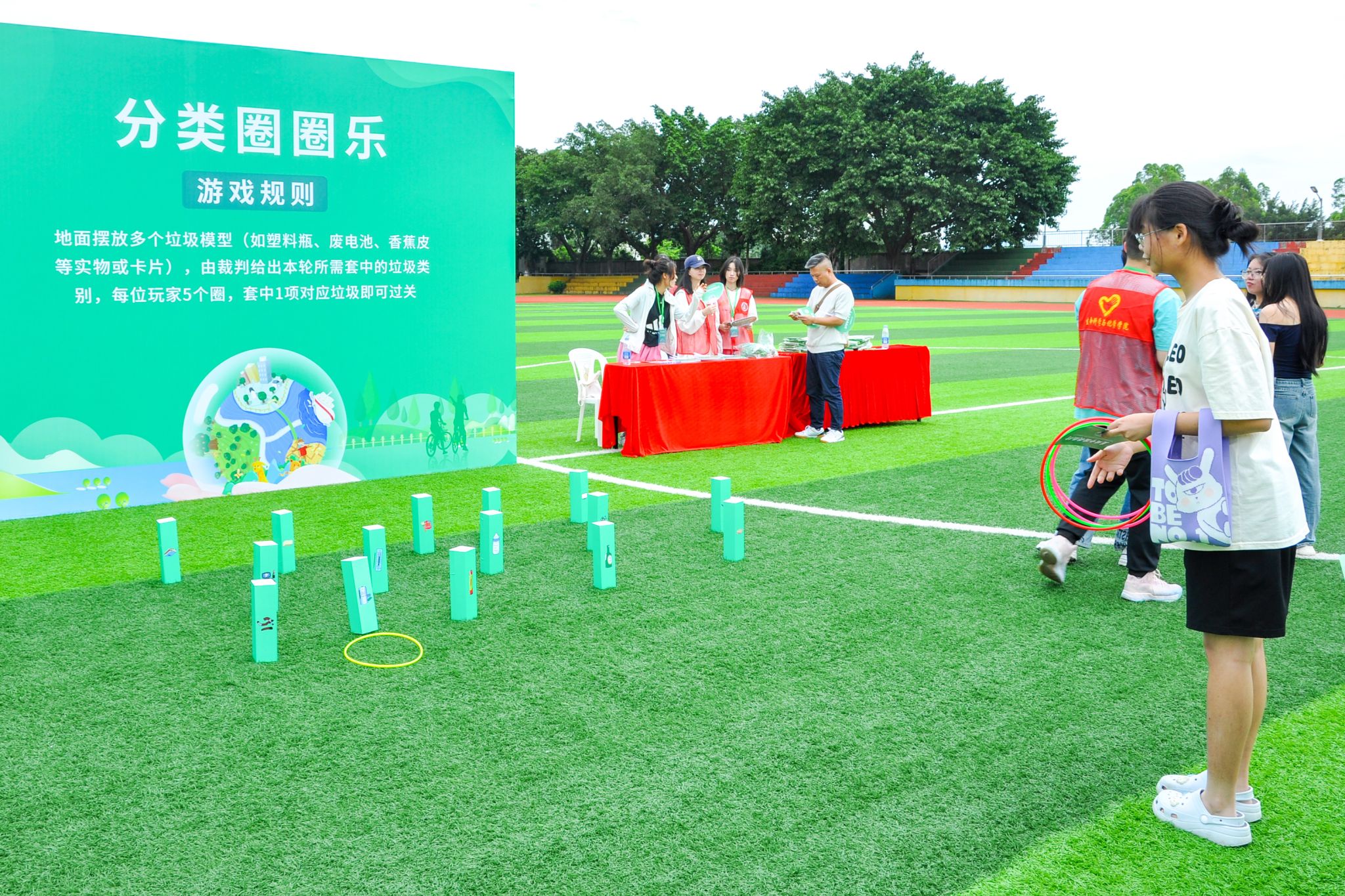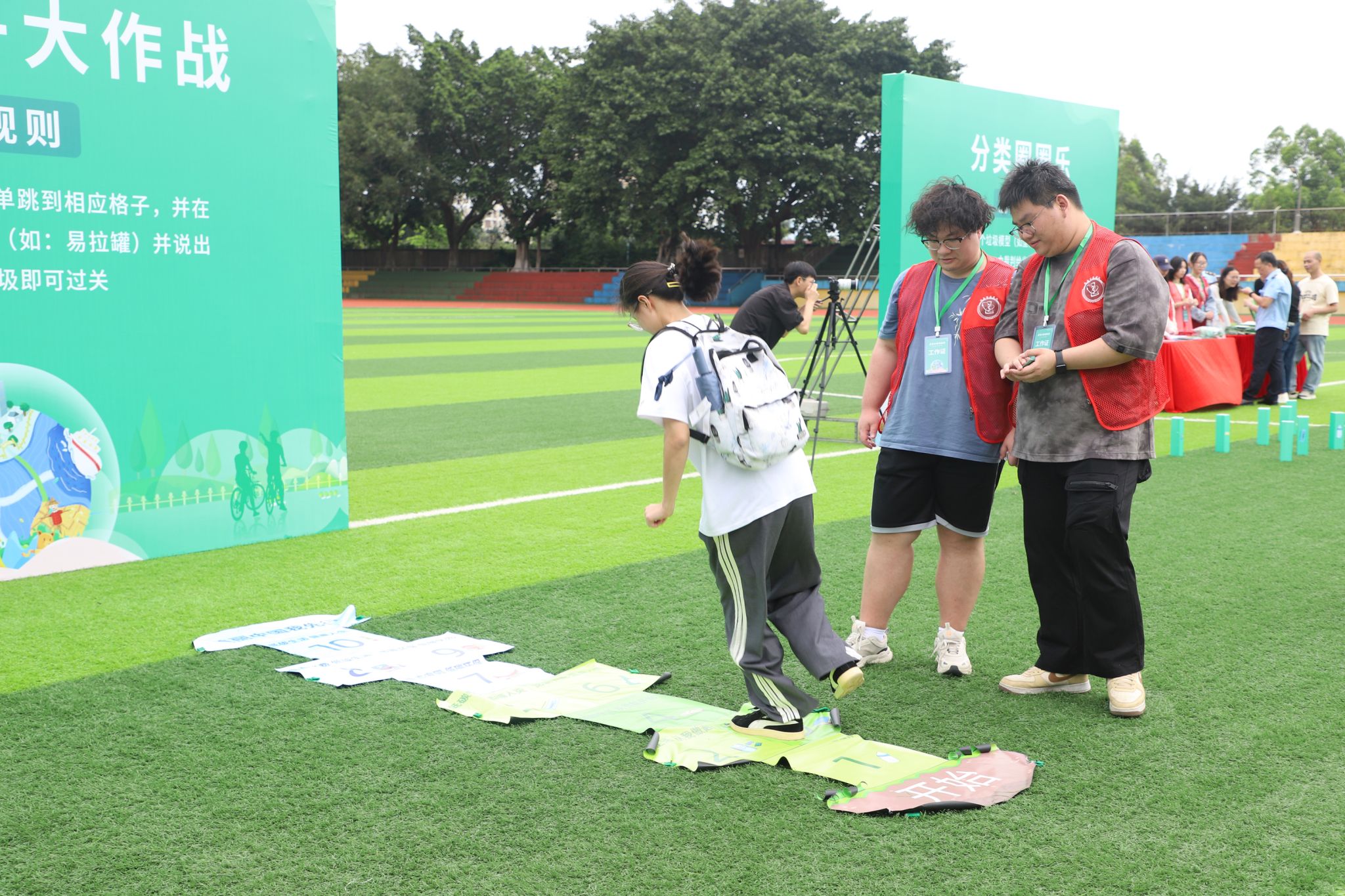 与会领导嘉宾共同启动“美丽中国我先行”环境日活动。活动通过设立咨询台、摆放宣传展板、发放宣传资料等方式,面对面向广大师生答疑解惑,进行普法宣传。活动还设置了环保格子大作战、分类圈圈乐等游戏,加深大家对环保知识的理解。