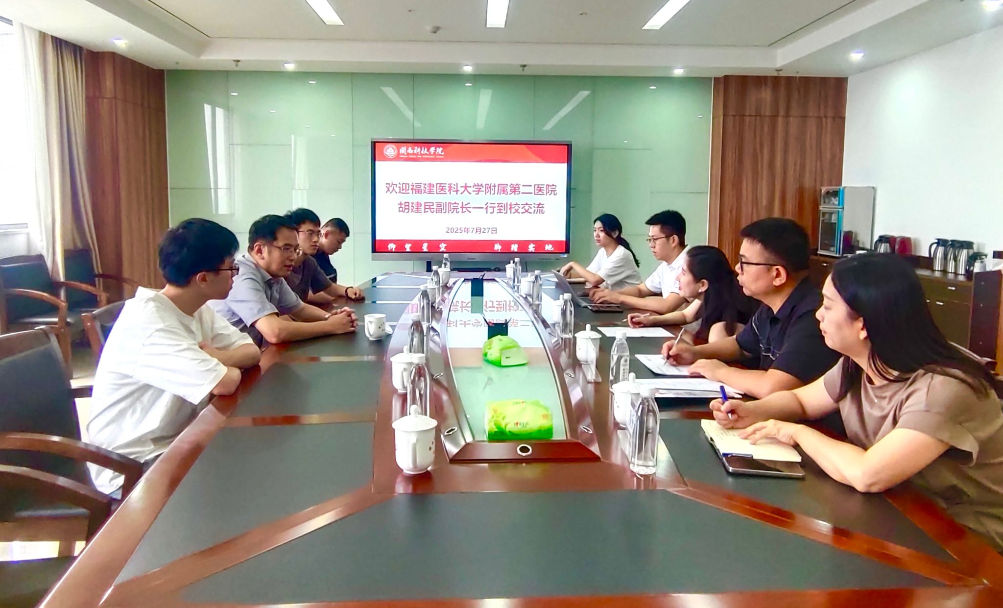 7月27日,福建医科大学附属第二医院副院长、福建省儿童青少年近视防控研究中心主任、视障辅助技术福建省高校工程研究中心主任胡建民教授带队莅临乐鱼网页版登录入口_乐鱼(中国)开展调研交流,副校长岳瀚槭出席座谈会,光电信息学院、科研处有关负责同志参加活动。