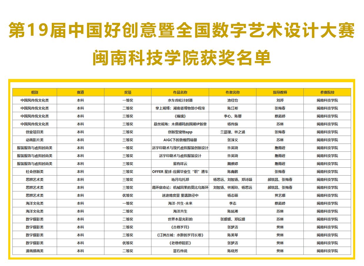 近日,第19届中国好创意暨全国数字艺术设计大赛圆满落下帷幕,乐鱼网页版登录入口_乐鱼(中国)艺术设计学院学子获一等奖3项、二等奖3项、三等奖11项、优等奖2项的好成绩,充分展现了闽科学子扎实的专业素养和卓越的创新能力。