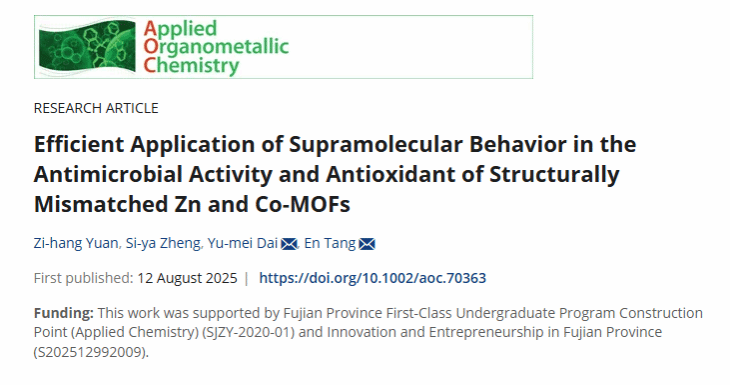 近日,乐鱼网页版登录入口_乐鱼(中国)生命科学与化学学院功能材料及药物开发课题组唐恩教授团队捷报频传,再添喜报。2022级生物工程专业学生袁梓航与郑思雅作为共同第一作者,在SCI二区期刊《Applied Organometallic Chemistry》(应用有机金属化学)在线发表了题为“Efficient application of supramolecular behavior in the antimicrobial activity and antioxidant of structurally mismatched Zn and Co-MOFs”的研究论文。