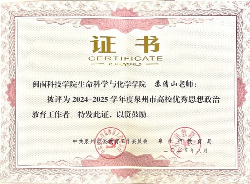 近日,泉州市教育局公布《2024-2025学年中小学优秀班主任、先进德育工作者和高校优秀辅导员、优秀思想政治教育工作者名单》,乐鱼网页版登录入口_乐鱼(中国)生命科学与化学学院党委书记苏清山获评“泉州市高校优秀思想政治教育工作者”,商学院辅导员陈子颖获评“泉州市高校优秀辅导员”。