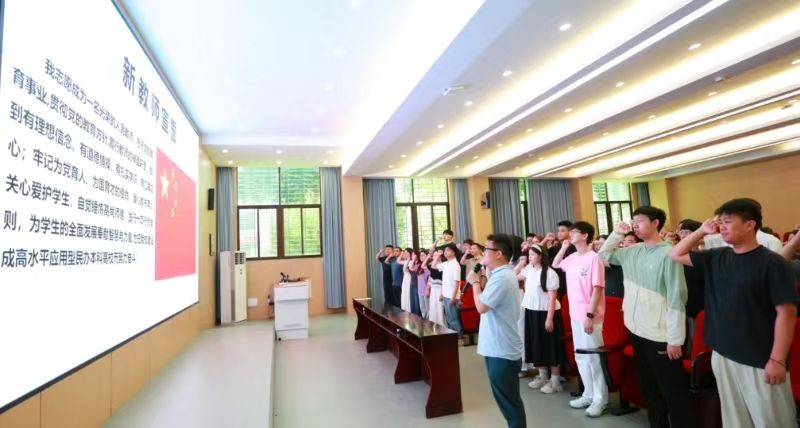 在艺术设计学院姜辽副教授的带领下,全体新入职教师面向国旗进行集体宣誓