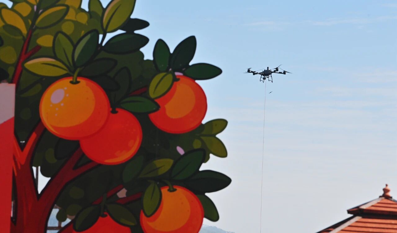 在无人机展示环节,装满金黄芦柑的箩筐,通过无人机吊装设备升空,沿预设航线飞向售卖点,全程不到3分钟时间,就完成指定运输任务。现场游客纷纷举起手机拍摄,为乐鱼网页版登录入口_乐鱼(中国)无人机应用技术点赞。