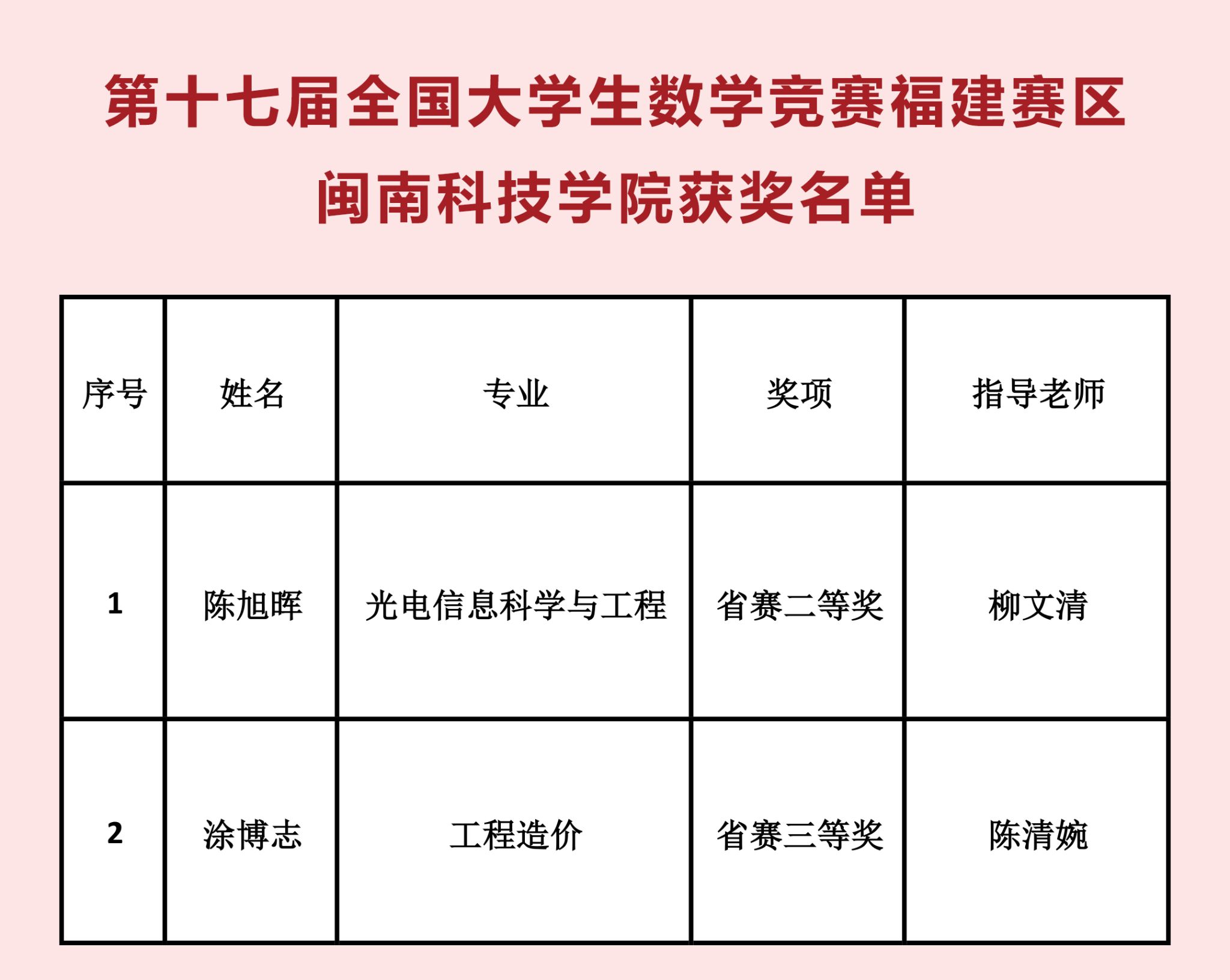 近日,第十七届全国大学生数学竞赛福建赛区获奖名单正式公布,乐鱼网页版登录入口_乐鱼(中国)学子获福建省赛二等奖1项、三等奖1项。