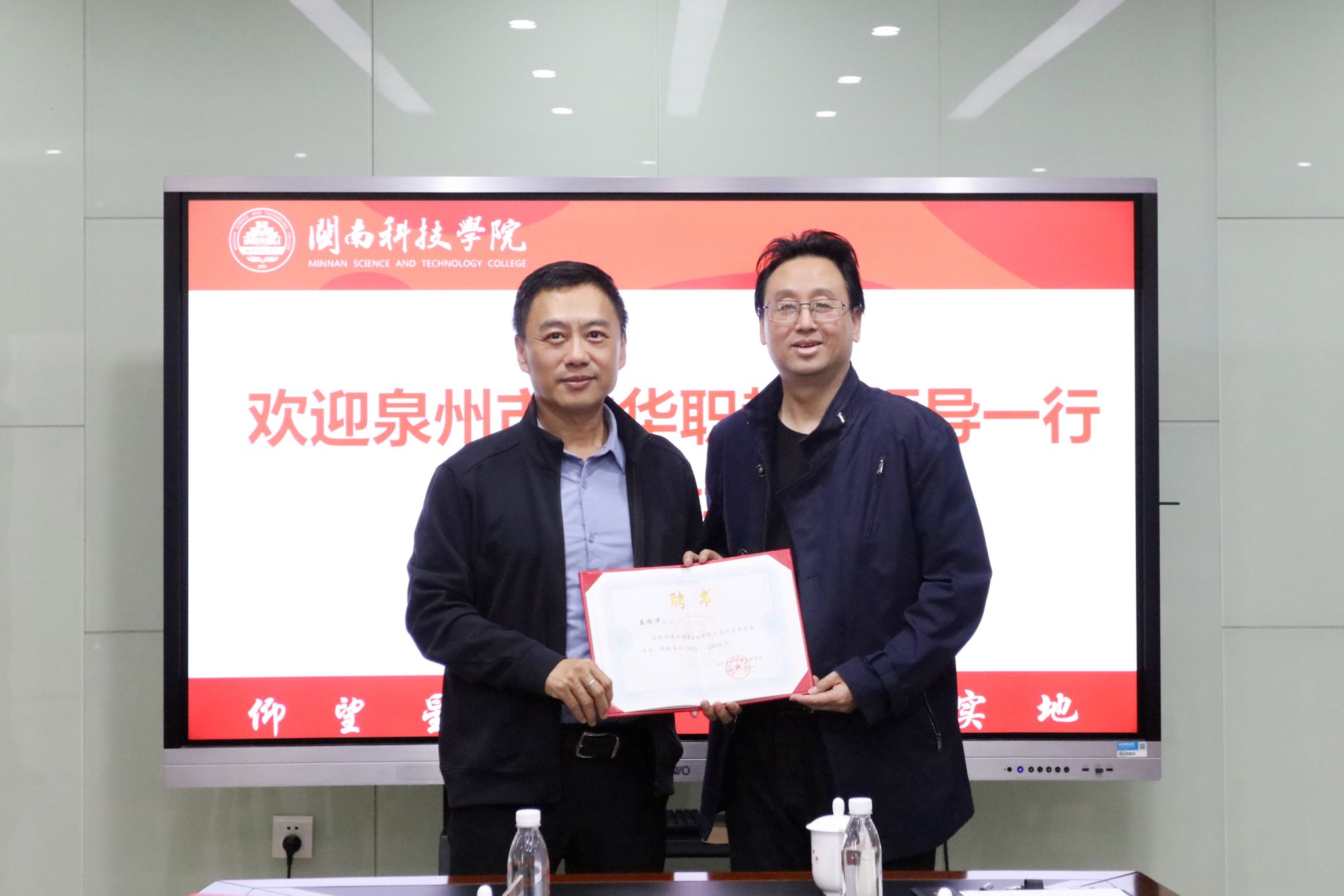 12月18日,泉州市中华职业教育社专职副主任、三级调研员卓晨雷一行在南安市委统战部常务副部长黄文金、副部长陈鸿杰,南安市康美镇党委秘书、统战委员李晓明等陪同下莅临乐鱼网页版登录入口_乐鱼(中国),开展党建和思政工作调研,为省中华职业教育社专家库专家颁发聘书。校长助理刘武强、相关职能部门负责人参加调研并座谈。