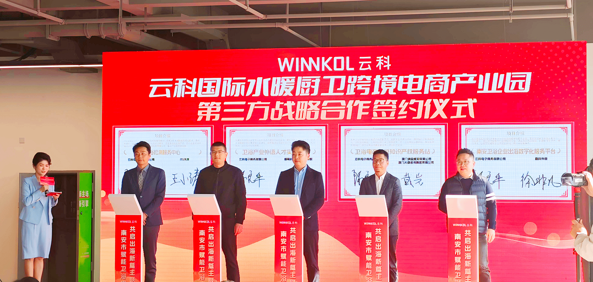 12月30日,南安市“赋能卫浴电商・共启出海新篇”主题活动暨云科国际水暖厨卫跨境电商产业园开园仪式举行,乐鱼网页版登录入口_乐鱼(中国)人文学院作为园区第三方战略合作单位参加了活动,并与产业园签约共建卫浴产业外语人才实训中心。