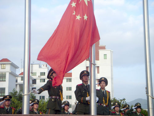 在激扬的《歌唱祖国》乐曲声中,护旗队踏着整齐的步伐,护送着国旗走向升旗台。当响亮的国歌声响起,全体师生注目行礼,目睹鲜艳的五星红旗冉冉升起,沉浸在祝愿祖国日益强盛、祝愿学院蓬勃发展的喜悦当中。