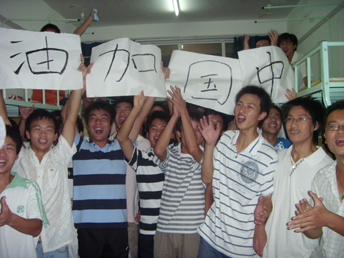 在学生宿舍,同学们为了及时收看到“神七”飞船升空这一激动人心的历史时刻,早早就聚集在一起,守候在电视机旁观看电视直播。北京时间21点10分“神七”顺利升空时,同学们难掩心中的激动和喜悦,纷纷鼓掌、欢呼,举着手中的标语,高喊着“中国加油”。