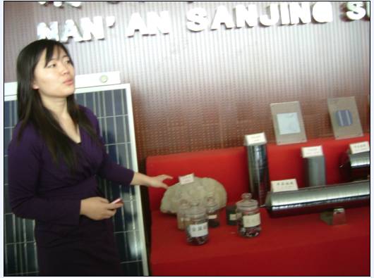 用自己提炼的单晶制造硅光伏电池,原料与产品生产一条龙是三晶的特点,这在全国实属罕见,学生实地考察了太阳能电池生产全流程:a、提纯 b、拉棒 c、切片 d、制电池 e、封装。 还向技术人员请教了一些课堂上碰不到的问题,有的同学结合光电导盲犬,光电卸载等竞赛课题请教硅光电池的参数指标及价格。