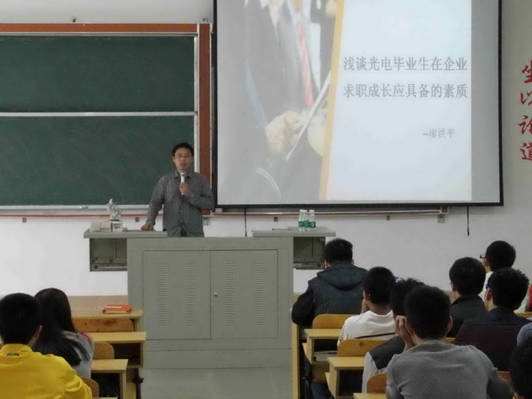 讲座上,廖洪平以福建福晶科技股份有限公司为例,详细介绍了光电行业分类、光学元件制造和企业人才必备能力等方面的内容。廖洪平鼓励同学们,在校期间加强应用技能实践,学会全面思考问题,团结协作,努力在竞争日益激烈的当今社会脱颖而出。
