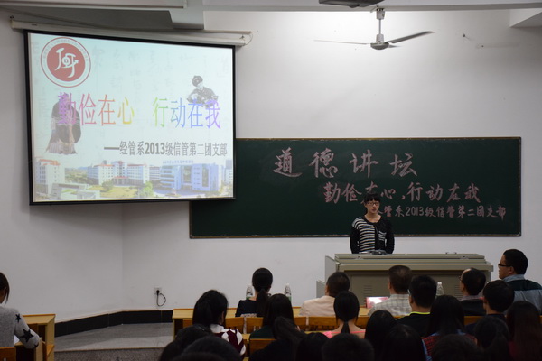 16日,2013级工商管理专业举办以“智出自立,傲然屹立”为主题举办首场道德讲堂活动,围绕“自立自强”主题,分“听一首歌曲”、“颂一段诗歌”、“看一部短片”、“讲一个故事”、“谈一些感受”、“做一个游戏”六个环节展开。在“讲一个故事”环节中,该专业的张超同学讲述亲历的自强励志故事,他从做家教赚、当服务生到组织在校生为南安车展提供全方位的服务,从而赚到第一桶金,如今他已经实现自己解决学费和生活费的诺言。他有一个创办一所中小学课外辅导机构的梦想,这个梦想雏形已定,他正在向着这个梦想而大步迈进。随后,广大师生同学起立就“自立自强自信”这一品质抒发了感想。邱永渠院长受邀参加活动,并在总结发言中向大家诠释了自强自立的中华传统美德,他希望广大师生通过道德讲堂活动,引导学生们用一颗自立的心去生活,用实际行动去回报他人和社会,做一个有自强自立的人,营造文明和谐的社会新风。