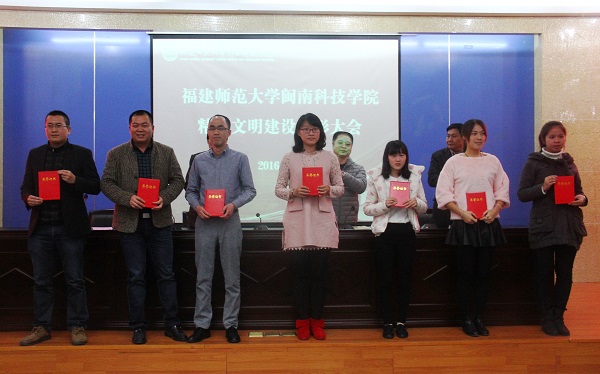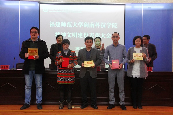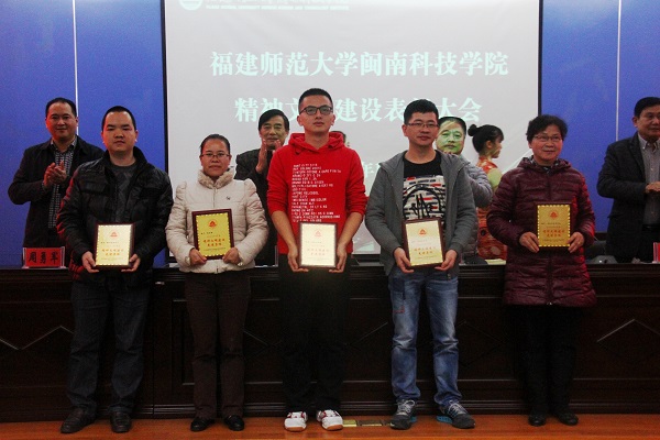 随后,周勇军副院长宣读了2014—2015年度精神文明建设先进集体和先进个人表彰名单。主席台领导为获奖单位代表和个人颁奖。会议表彰了学院办公室等5个单位“2014-2015年度精神文明建设先进集体”称号,孙文缘、陈秋萍等8名师生“2014-2015年度精神文明建设先进个人”荣誉称号,林佳喜、潘昊炜等3个家庭“2014-2015年度精神文明建设文明家庭”称号,康美校区兰苑6#611、美林校区菊苑A#401等16间宿舍“2014-2015年度精神文明建设文明示范宿舍”称号。