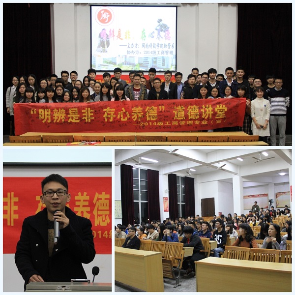 20日, 2014级工商管理专业举办“明辨是非,存心养德”主题道德讲堂活动。活动分为“观一段视频”、“知一门学问”、“输一条微博”、“讲一个故事”、“赏一则小品”、“谈一个感受”六个环节。在“谈一个感受”环节中,同学们各抒己见,纷纷表达崇德向善、知理尚义的行为观念,来自2015级工商管理专业张嘉诚同学说:“用明亮的双眼明辨是与非,存一颗善心养一份恩德。”2014级工商管理专业辅导员黄少阳在活动总结中表示,“明辨是非,存心养德”是当代大学生应当具备的基本品质,希望同学们见贤思齐,择善而从,不断提升道德素养,用正能量去感染身边的人,成为道德的传播者、实践者和受益者。