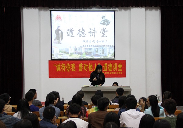 12月6日晚,经济管理系2014级信息管理与信息系统专业第二团支部举办“诚待你我,善对他人”主题道德讲堂活动。活动围绕“述一个道理”、“观一部短片”、“ 讲一段故事”、“唱一首歌”、“发一条微博”、“宣一则期望”、“听一番感悟”、“签一个名字”八个环节展开。
