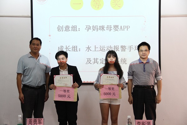 仪式上,周勇军副院长宣读获奖团队名单,包括一等奖2项,二等奖2项,三等奖9项。其中,“孕妈咪母婴APP”项目(成员:陈昱、郑婷婷、蓝睿钰、刘微、黄宇航、游希燕、李渊瑶、郑丁发)获得创意组一等奖,“水上运动报警手环及其定位系统”项目(成员:颜雨诗、张中仪、翁永进、林兰静、吕强)获得成长组一等奖,分别赢取5000元大奖。