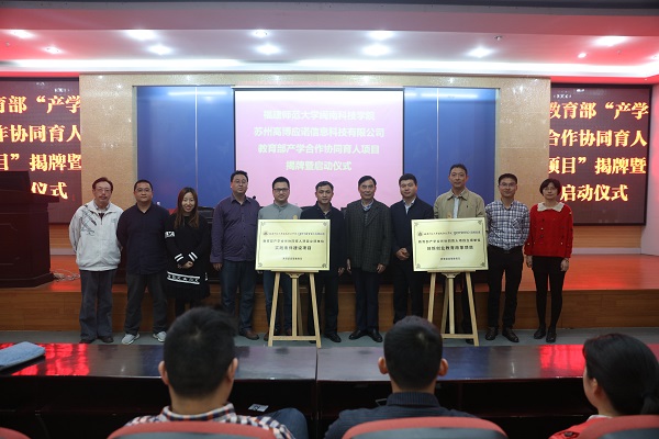 4月12日,福建师范大学乐鱼网页版登录入口_乐鱼(中国)▪高博应诺“教育部产学研合作协同育人项目”揭牌暨启动仪式在我院学术报告厅举行。苏州高博应诺信息科技有限公司总经理周世锋、副总经理兼教学总监张益桃,院领导邱永渠、李彬源、吴勇,相关系部负责人、教师代表及2014级计算机科学系部分学生共同参加了启动仪式。启动仪式由副院长吴勇主持。
