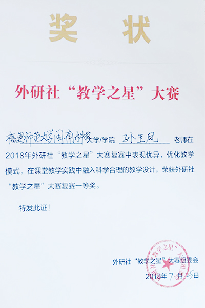 7月25日,2018年全国高等学校大学英语教学大赛暨外研社“教学之星”大赛复赛在天津举行,我院外语系孙玉凤老师荣获大赛一等奖。