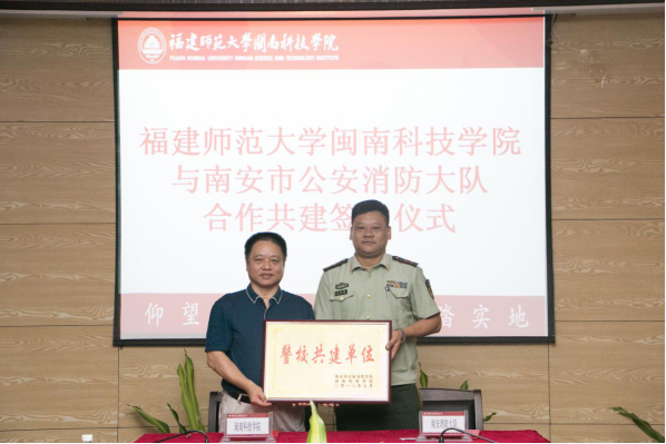 党委常务副书记林明旭、南安市公安消防大队政治教导员甘代辉分别代表双方在协议书上签字,南安市公安消防大队向我院颁授警校共建单位牌匾。