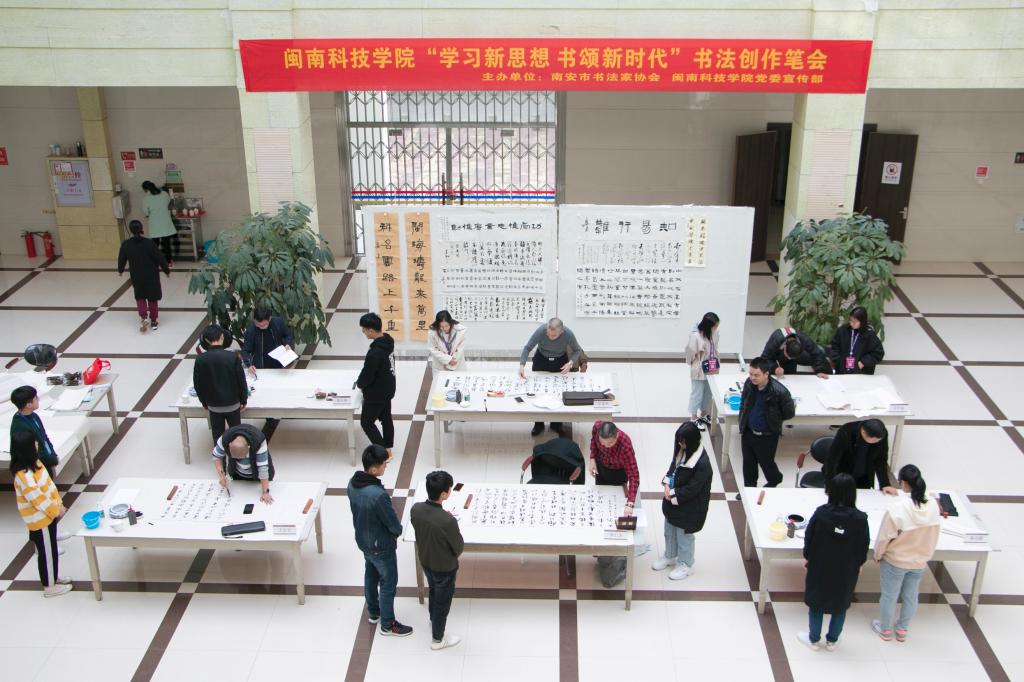 12月29日,学院党委宣传部联合南安市书法协会举办“学习新思想 书颂新时代”书法创作笔会,邀请李仁杰、潘高鹏、王忠书、王志安、范百和、苏学瑜6位书法家现场创作。学院党委副书记、副院长(主持工作)张杰前往现场观摩。