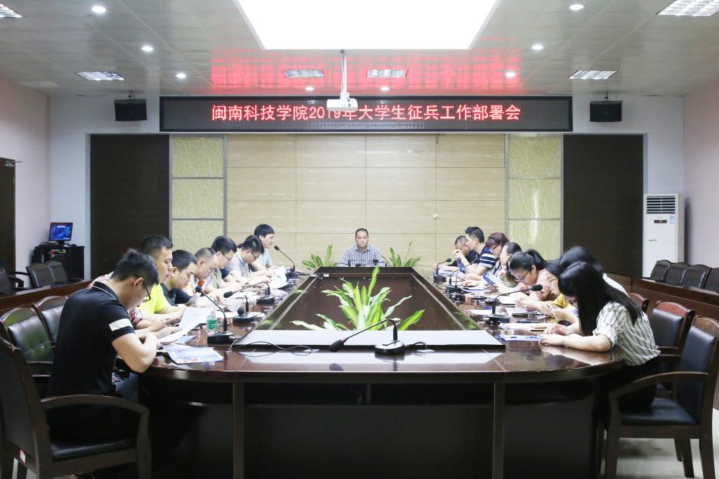 4月9日上午,我院在图书馆评建办召开2019年大学生征兵工作部署会。副院长周勇军,院长助理、学工部部长林树生,武装部、学工部、教务部、宣传部、财务部及各二级学院负责人,全体毕业班辅导员参加会议,会议由武装部部长苏清山主持。