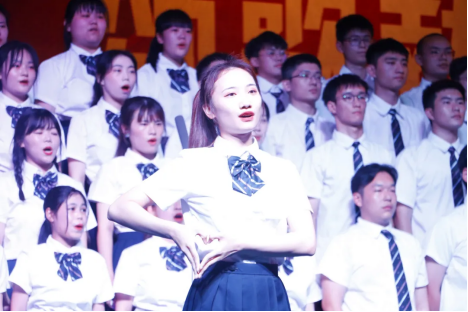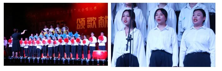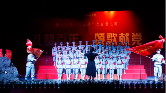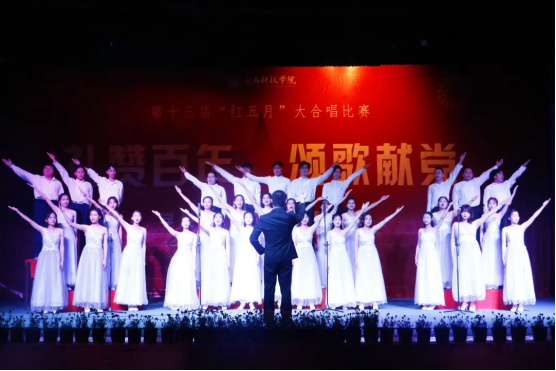 比赛现场,校大学生艺术团合唱团和18个专业合唱代表队一起用激昂的歌声和曼妙的旋律赞颂伟大的祖国和中国共产党,唱响《没有共产党就没有新中国》。