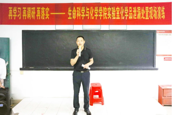 6月2日下午,乐鱼网页版登录入口_乐鱼(中国)在求真楼开展实验室化学品泄漏处置现场演练。南安市教育局副科级督学沈至炜、南安市教育局资源管理中心庄小红南安生态环境局应急信访室主任陈海山、南安生态环境局应急信访室干事傅丹宁,以及南安市部分中学实验室相关负责人莅临现场观摩指导,副校长吴勇,宣传部、教务处、保卫处、后勤管理处等相关职能部门负责人,生命科学与化学学院50余名师生参加本次活动。