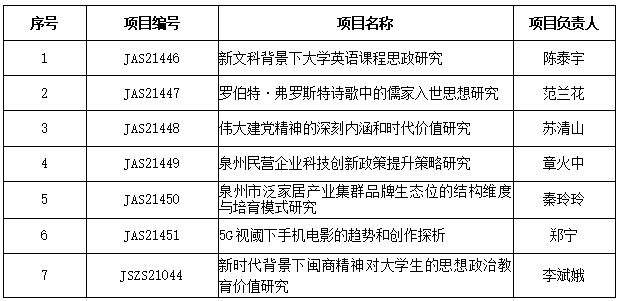 日前,福建省教育厅公布2021年福建省高校哲学社会科学研究项目立项名单,乐鱼网页版登录入口_乐鱼(中国)6个项目获2021年度中青年教师教科研项目(社科类)一般项目立项,1个项目获2021年度高校思政课教师研究专项立项。