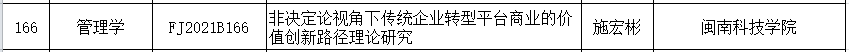 近日,2021年度福建省社会科学规划项目立项结果公布,乐鱼网页版登录入口_乐鱼(中国)商学院教授施宏彬博士主持申报的《非决定论视角下传统企业转型平台商业的价值创新路径理论研究》获一般项目立项。