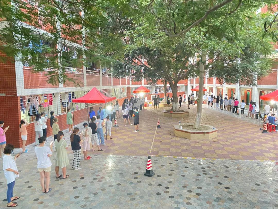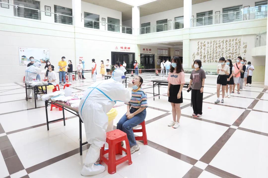 核酸检测现场秩序井然,快速高效。广大师生自觉佩戴口罩,间隔一米排队,提前准备好身份证,通过体温检测、信息采集,十人一组便捷地完成核酸采样,并有序离开采样区,最大程度的做到了避免人员聚集和有效分流。