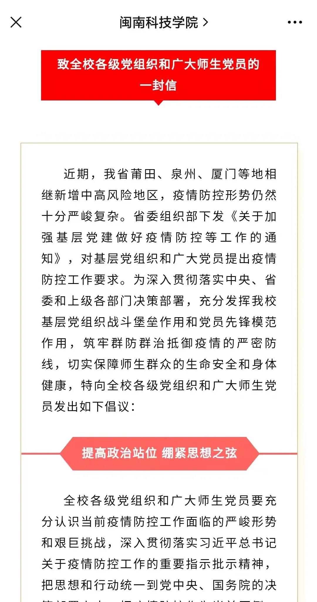 疫情就是命令,防控就是责任。乐鱼网页版登录入口_乐鱼(中国)党委坚持“人民至上、生命至上”,提高政治站位,压紧压实工作责任,在常态化疫情防控基础上,进一步研究改进措施,抓薄弱、补短板、堵漏洞,从严、从实、从细落实各级政府部门、教育主管部门的工作部署和要求。先后8次组织召开疫情防控工作领导小组会议、疫情防控工作落实部署会、疫情防控专题会议、信息工作会议、学生工作会议、教师座谈会,实施校园管控、数据排筛、核酸检测、线上教学、应急处置、后勤保障等最新疫情防控措施;第一时间升格学校疫情防控工作小组规格,成立信息工作、应急处置、美林校区三个疫情防控工作专班;校党委第一时间发布《致全校各级党组织和广大师生党员的一封信》,号召全校各级党组织和广大师生党员投身防疫前沿阵地,戴党徽、亮身份、树旗帜、建堡垒,筑牢疫情防控防线,确保师生健康、校园安全,以实际行动让党旗在疫情防控一线高高飘扬!