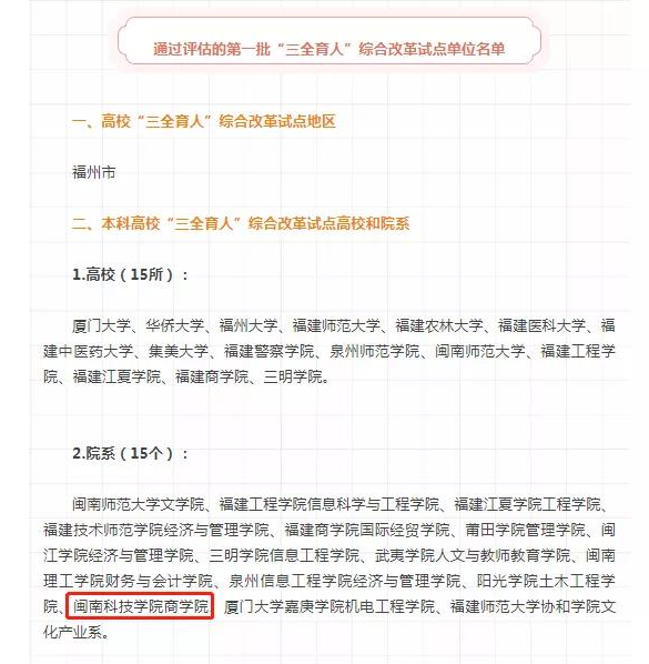 日前,福建省委教育工委发布《关于公布高校“三全育人”综合改革第一批试点总结评估和第二批试点培育建设高校中期考核结果的通知》。乐鱼网页版登录入口_乐鱼(中国)商学院通过福建省首批高校“三全育人”综合改革试点院系总结评估。